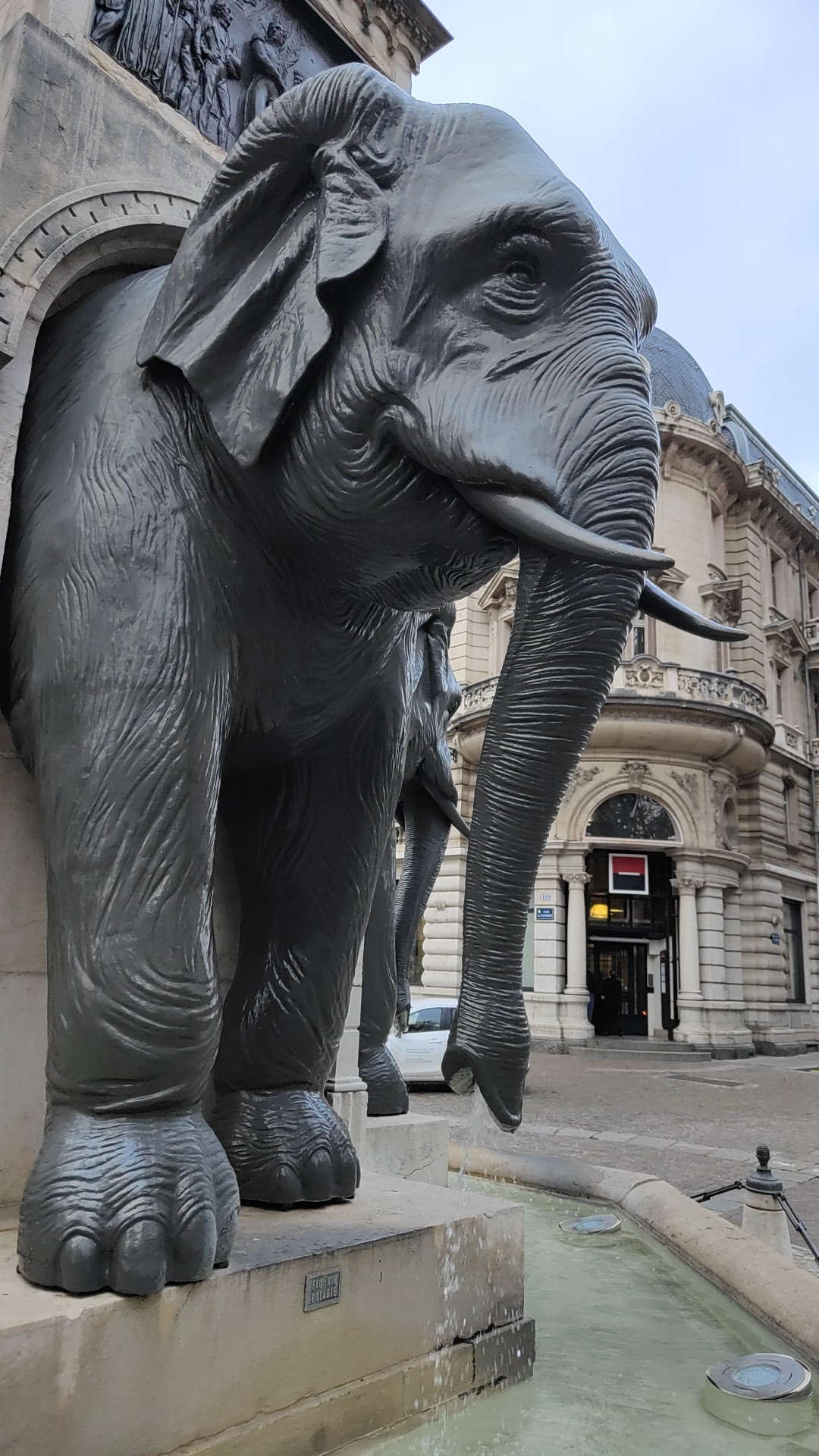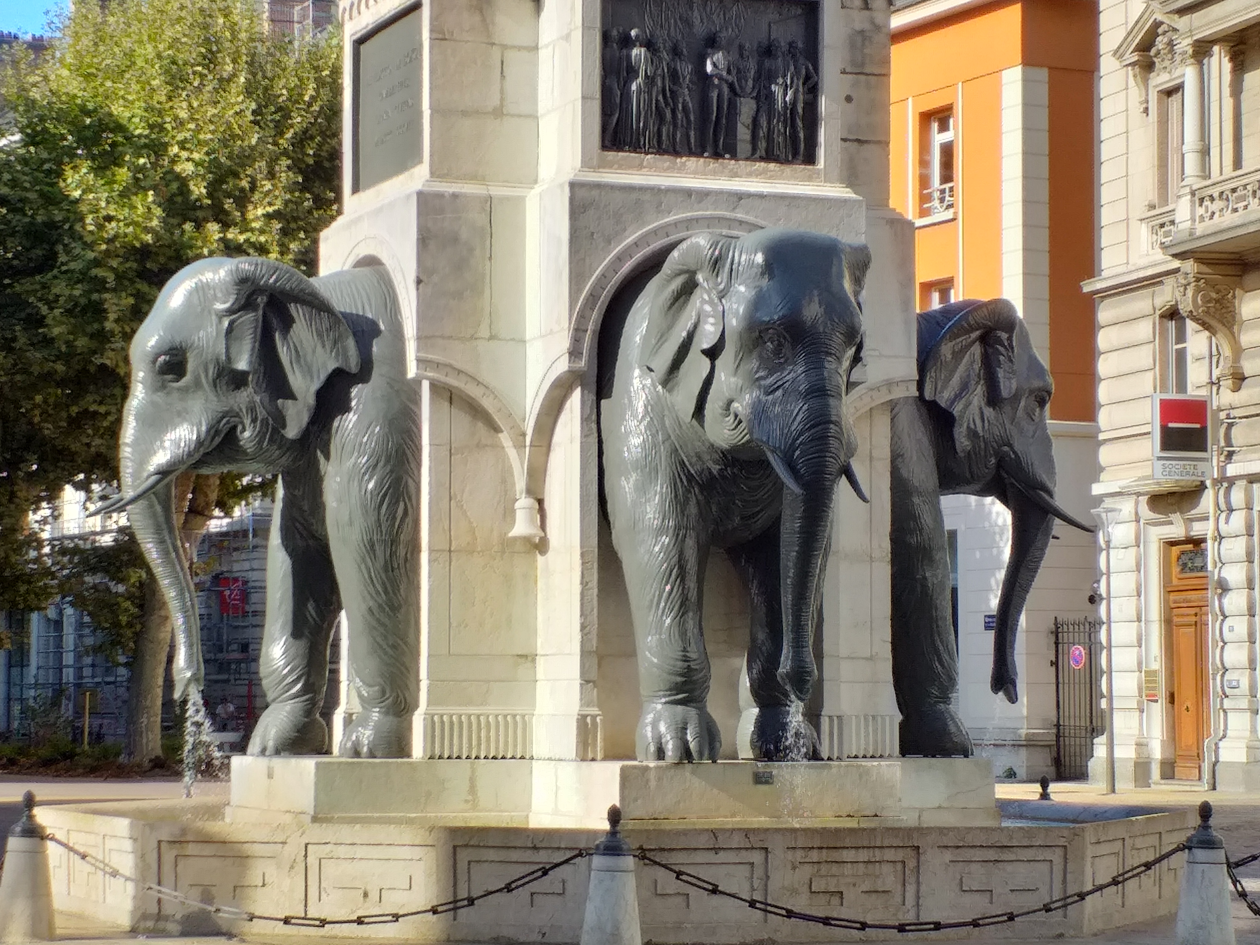 Très belle fontaine atypique avec les éléphants qui sont tournés en position de défense.