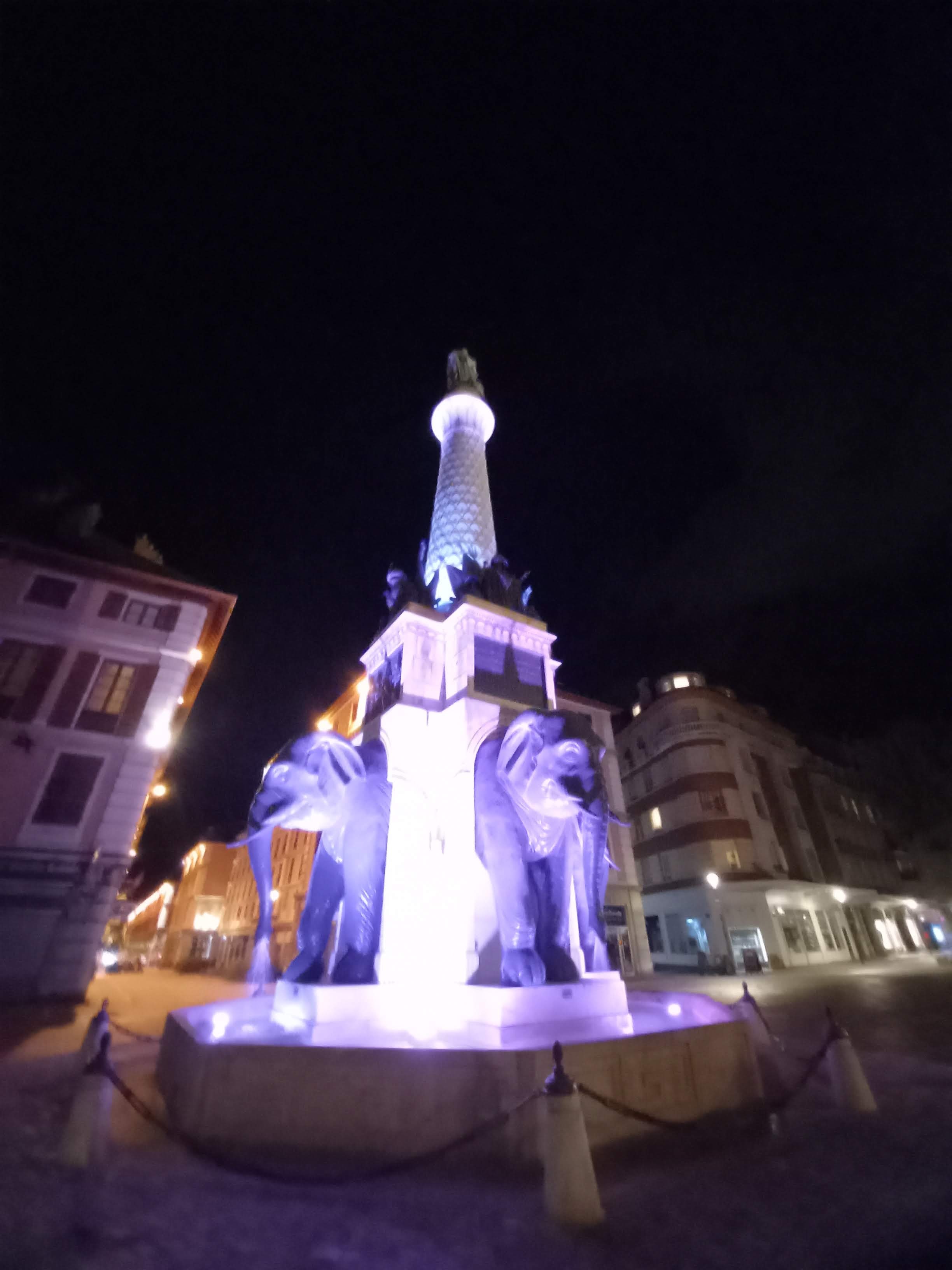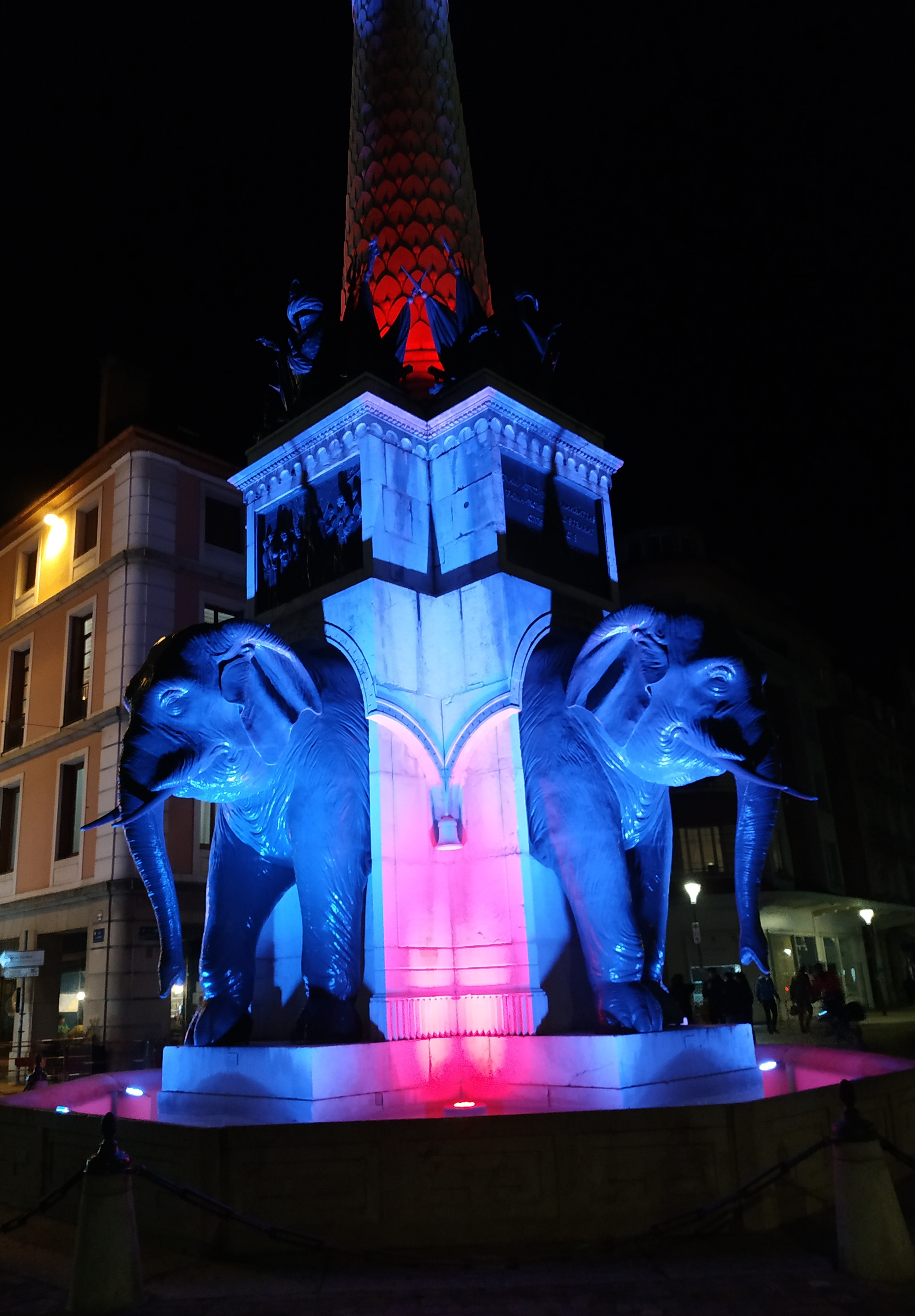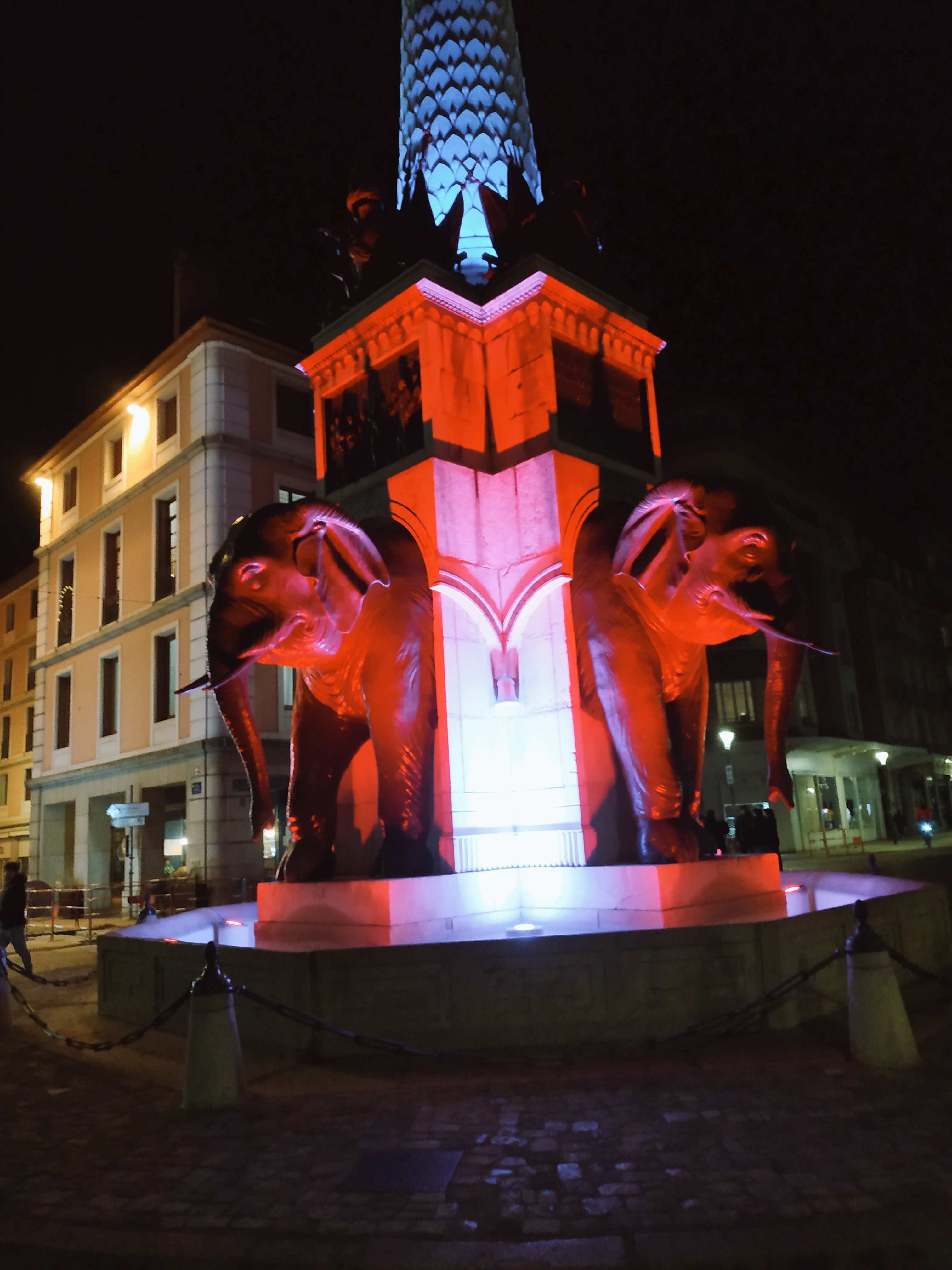 La fontaine des Éléphants se situe au cœur de la vieille ville historique de Chambéry, en face du château des ducs de Savoie. Aussi belle de jour que de nuit.