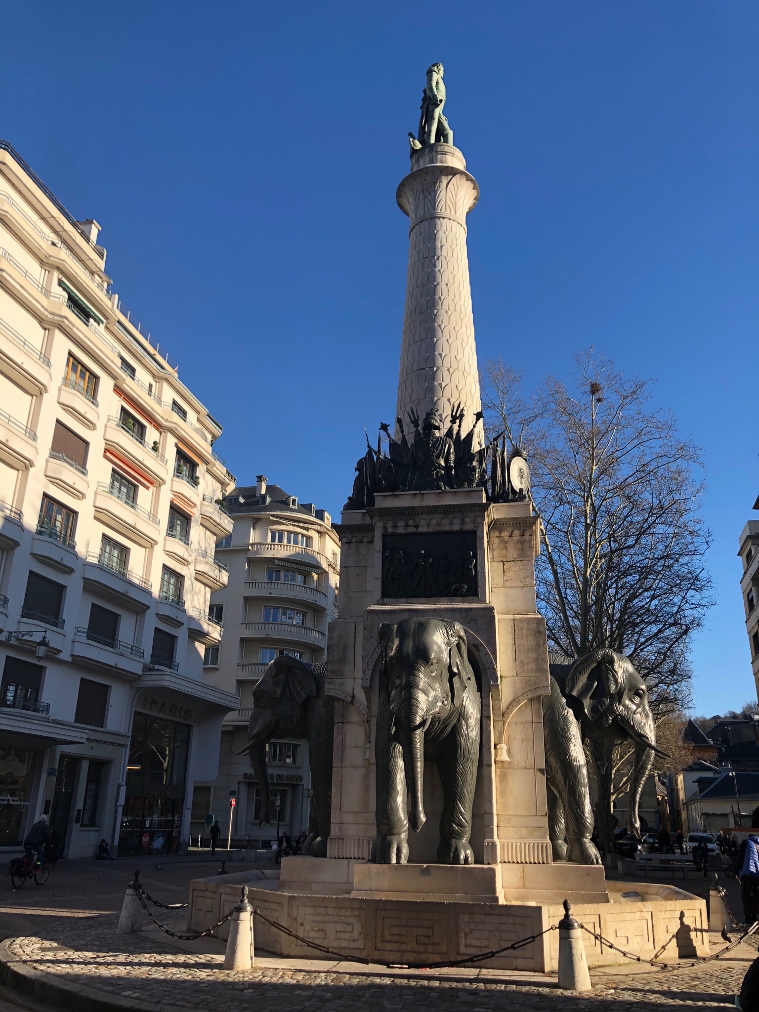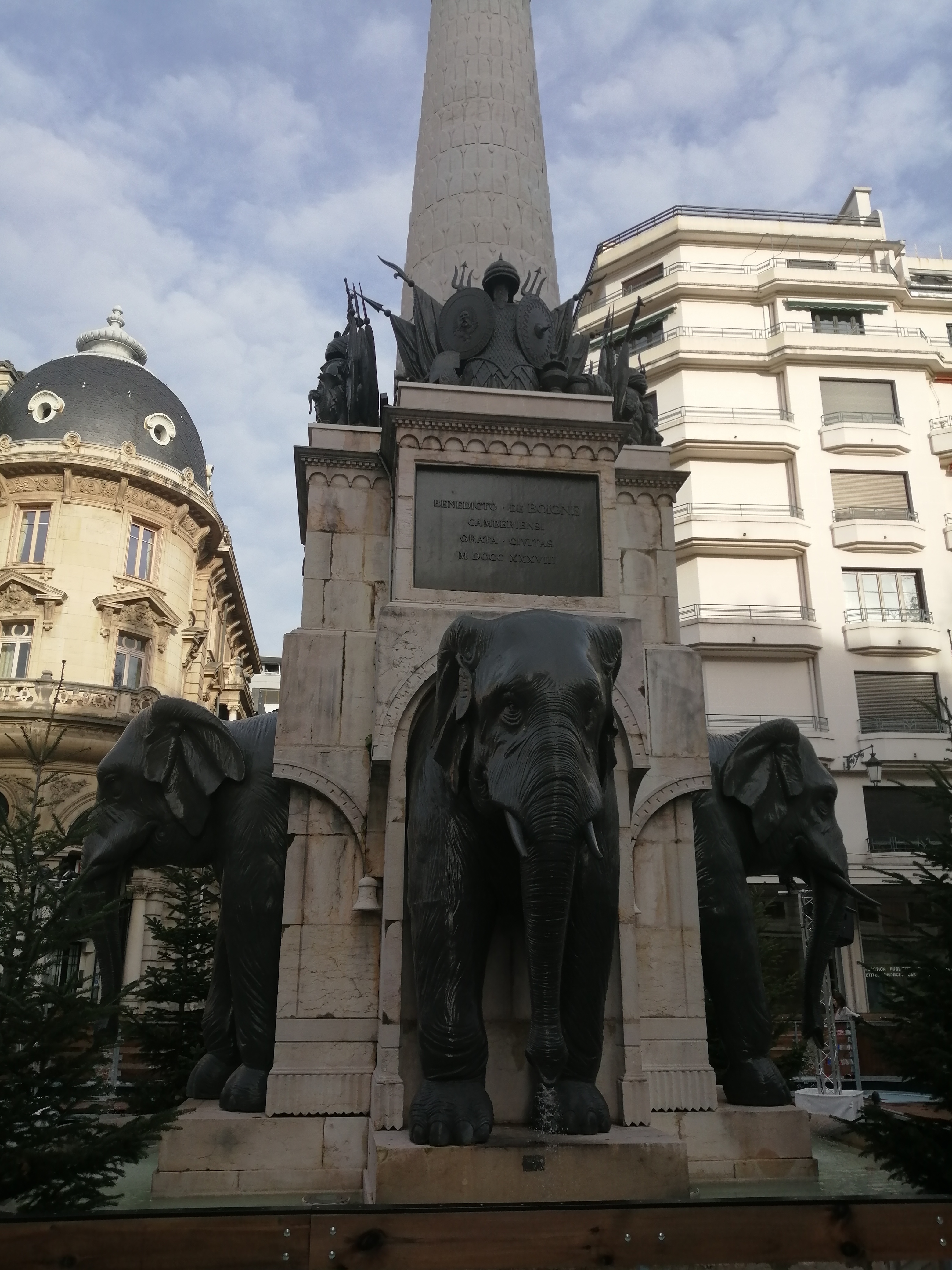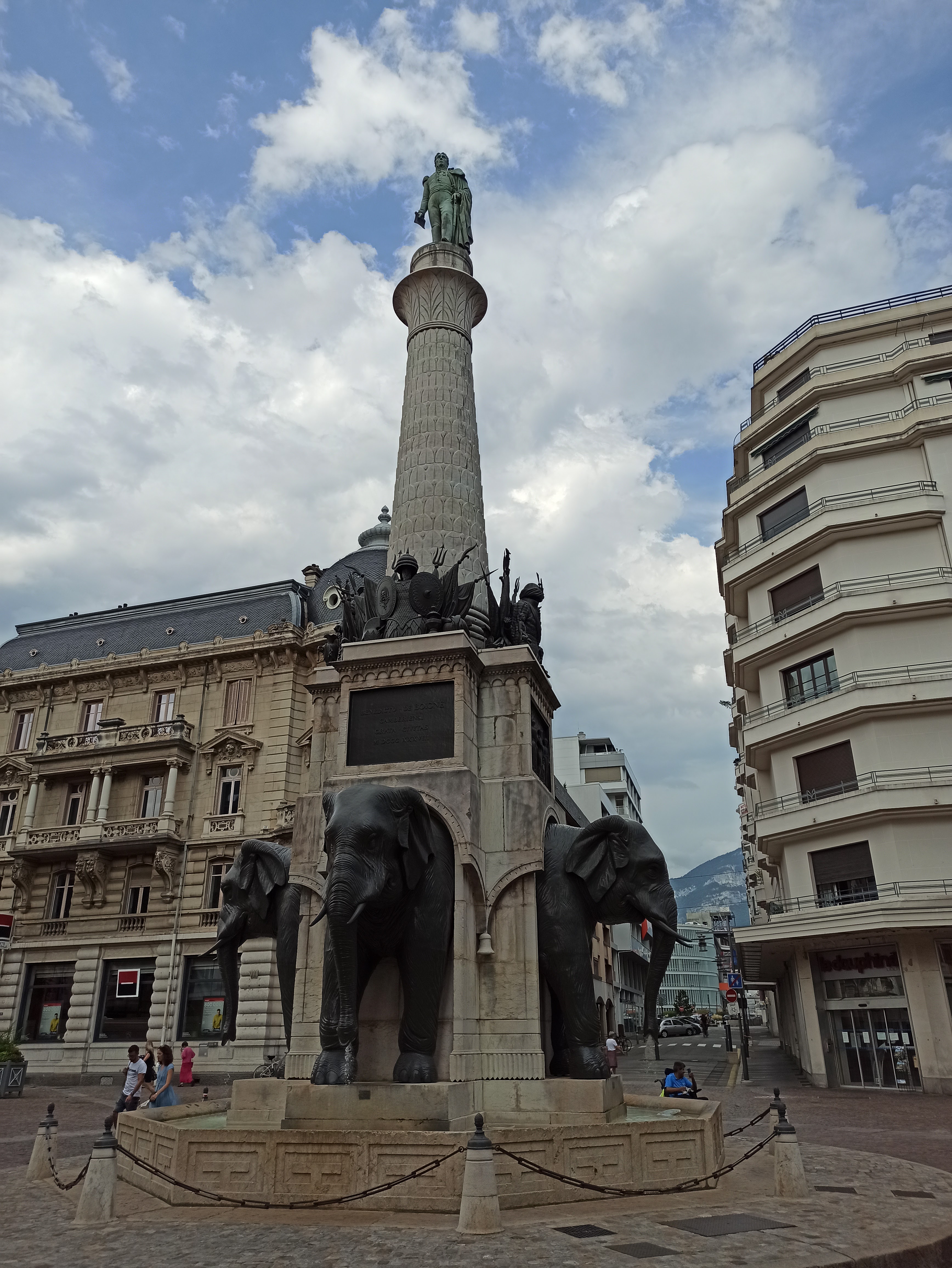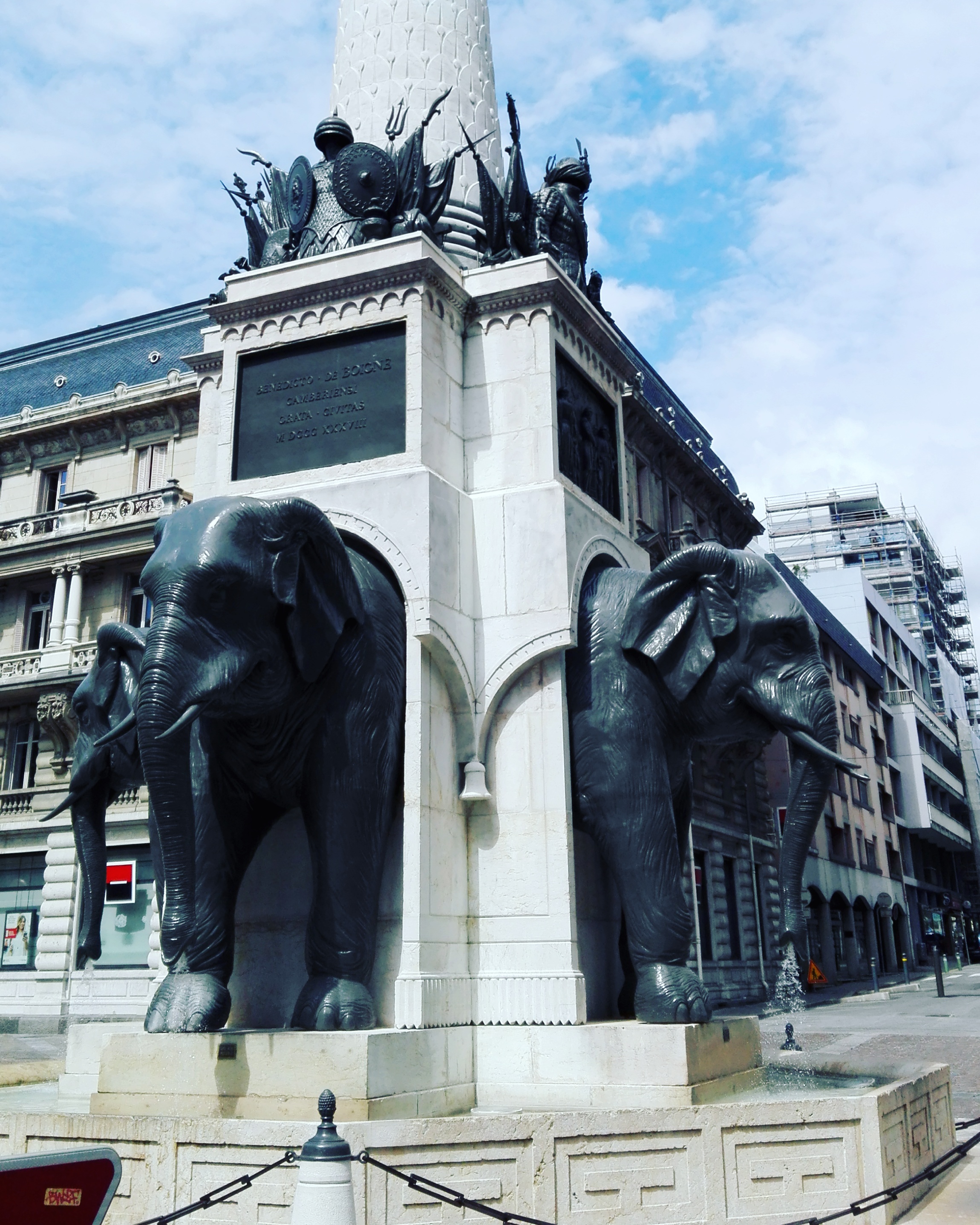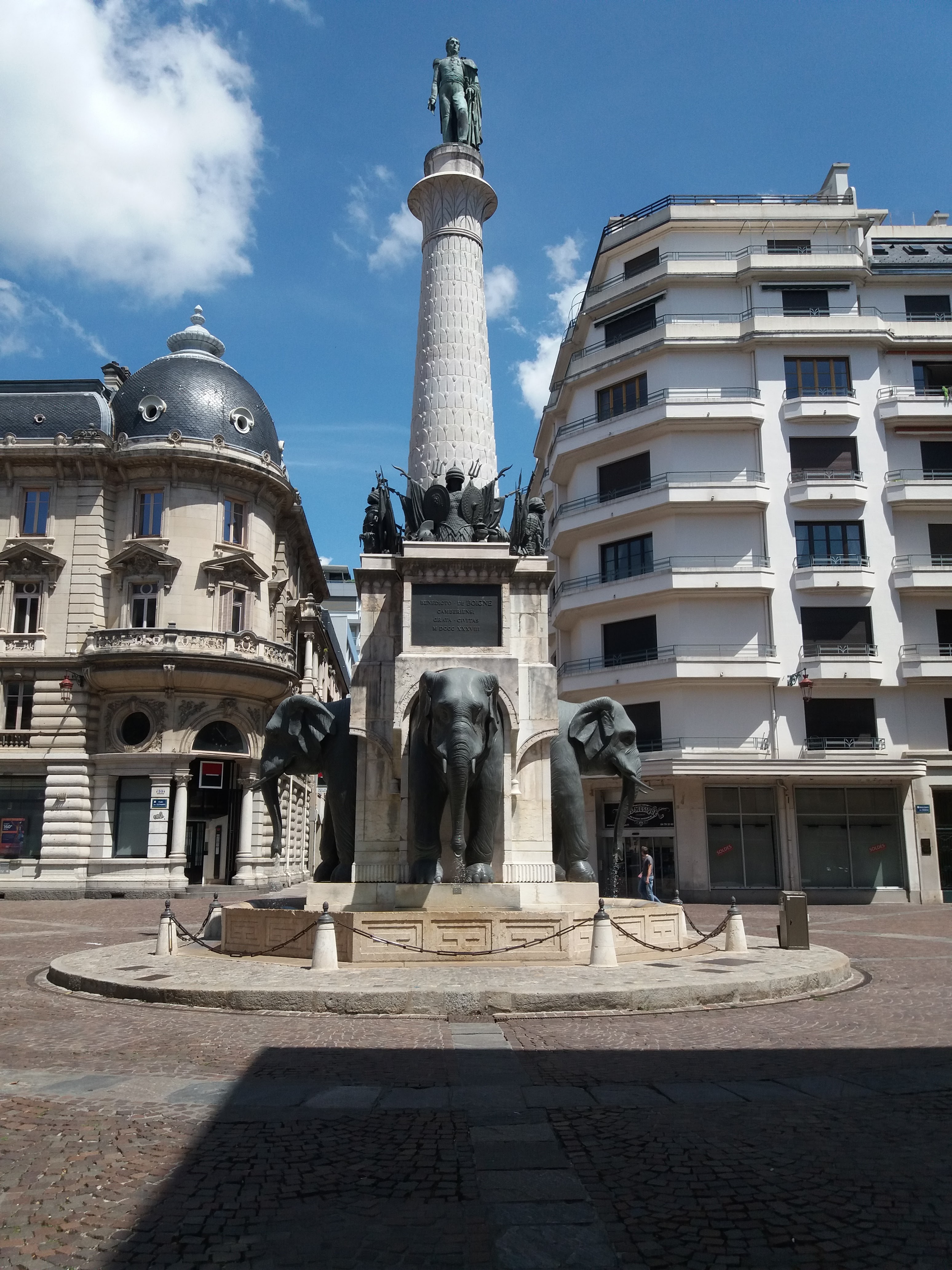 La Fontaine des Éléphants, appelée historiquement Colonne de Boigne et plus communément Les 4 sans ... est un monument historique incontournable de Chambéry. Vous avez dans le prolongement la rue de Boigne, avec ses arcades et le Château des Ducs de Savoie.