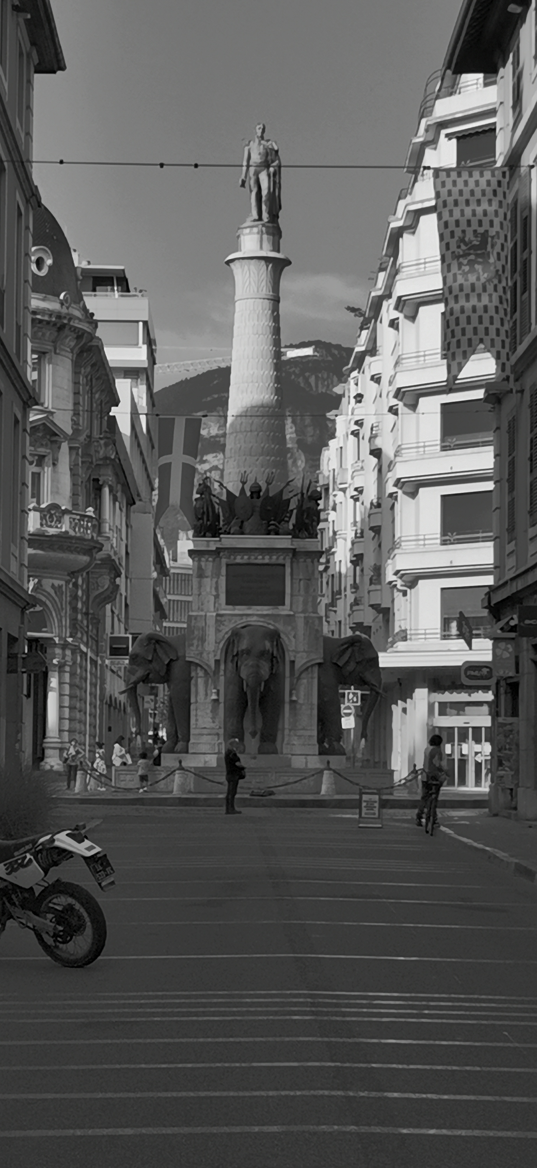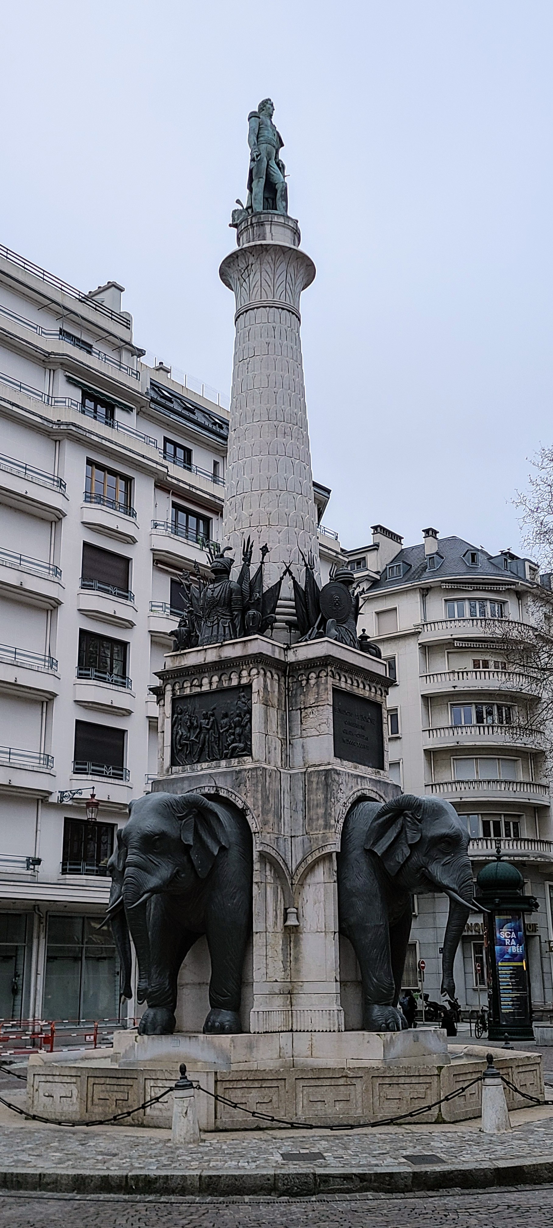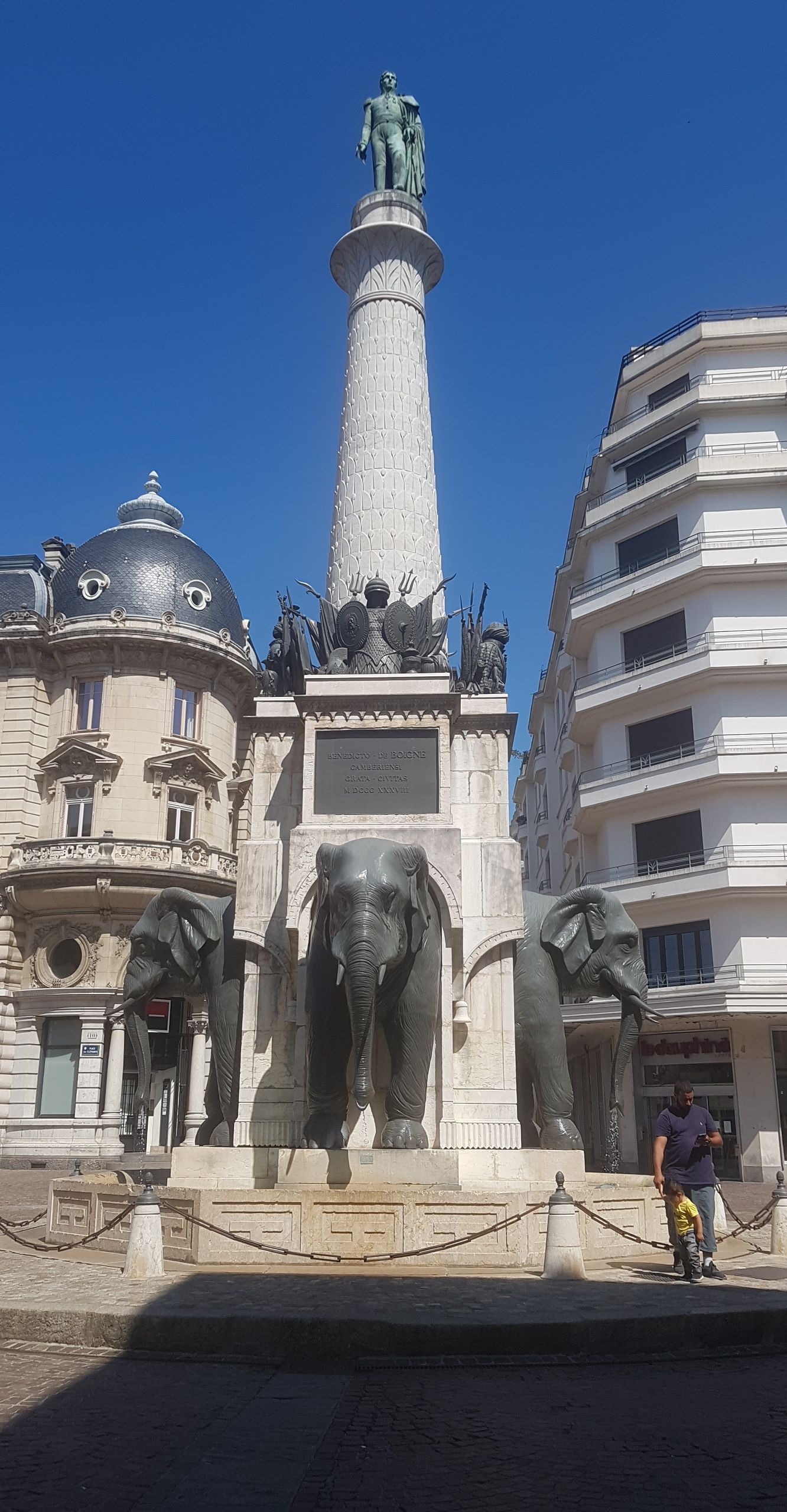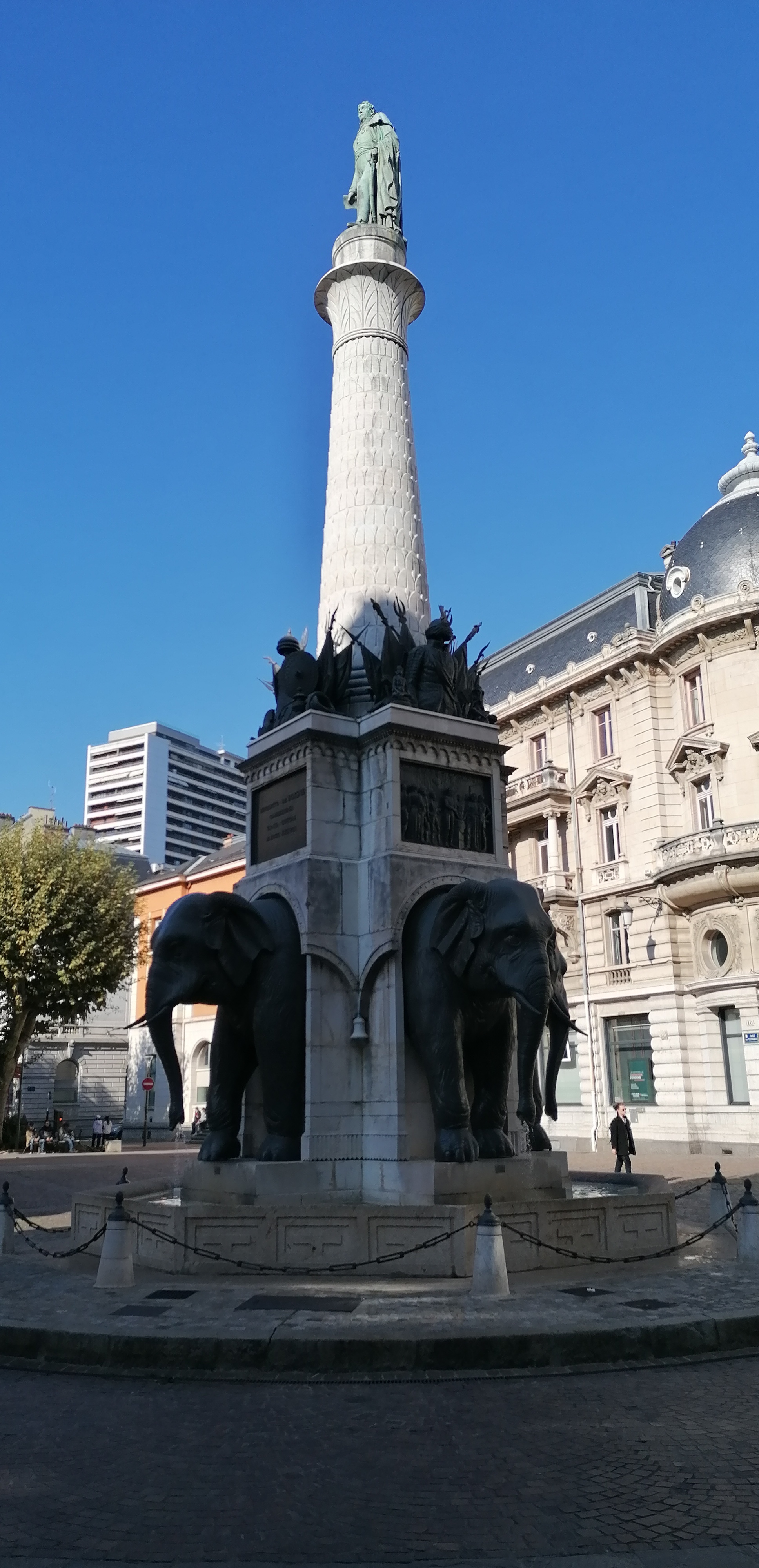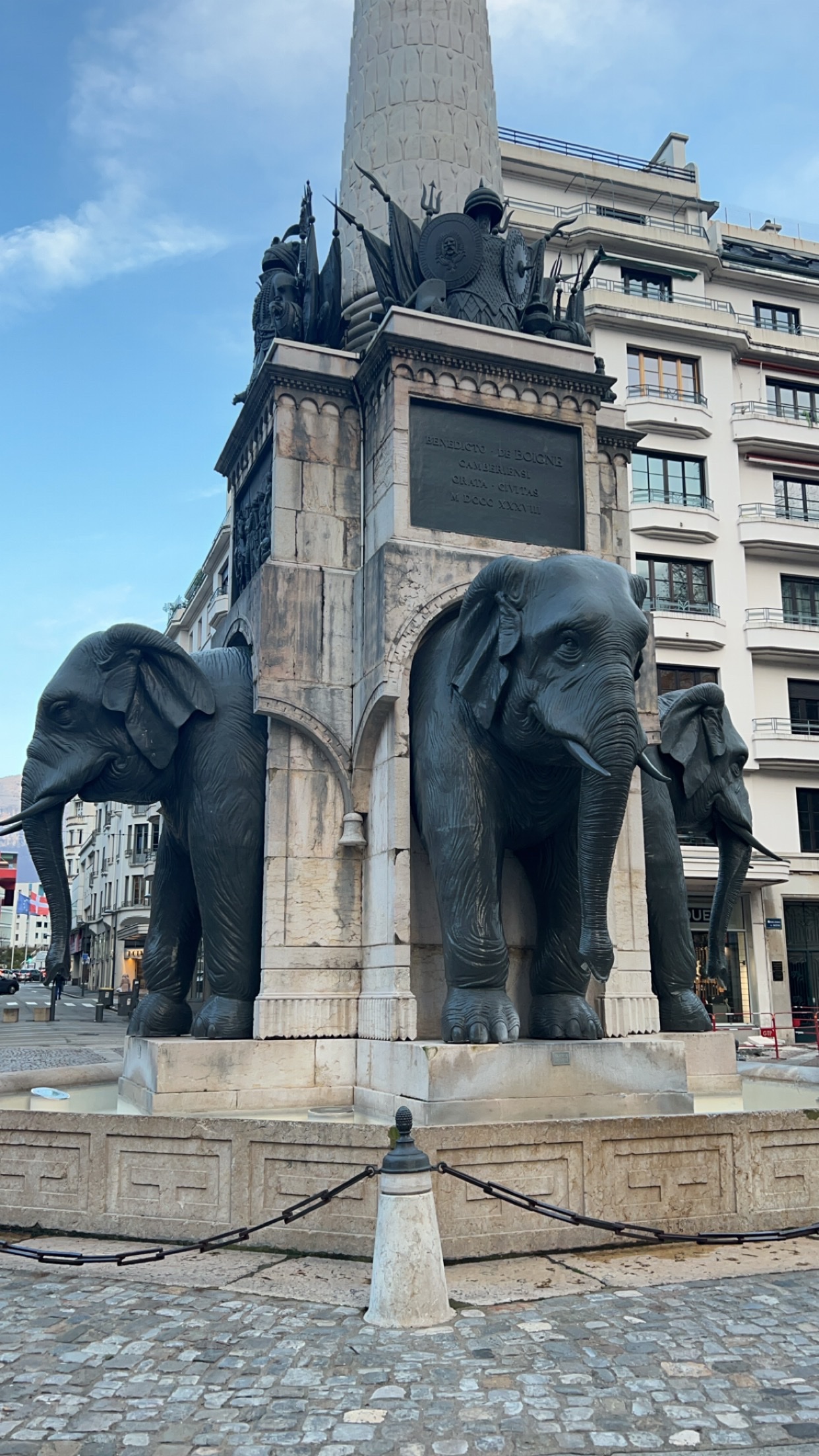 La Fontaine des Éléphants, appelée historiquement Colonne de Boigne et plus communément Les 4 sans ... est un monument historique incontournable de Chambéry. Vous avez dans le prolongement la rue de Boigne, avec ses arcades et le Château des Ducs de Savoie.