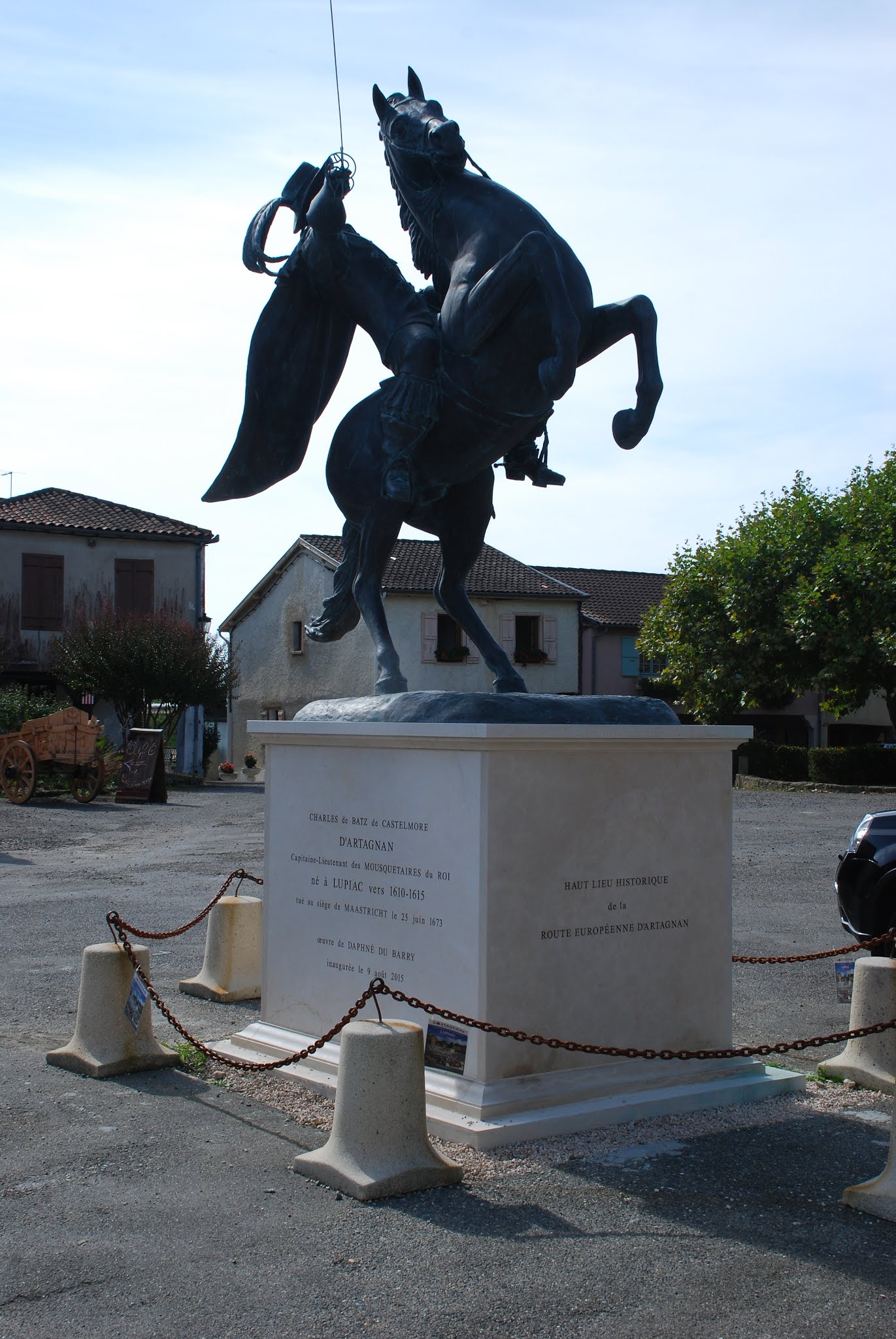 Grande et belle statue du Comte D'Artagan à cheval. Il est situé sur la place qui porte son nom, ainsi que la taverne qui se trouve sur cette même place. La place est entourée de maisons à l'architecture médiévale. La façade et les fenêtres de l'Hôtel de Ville (Mairie) sont belles à voir. Derrière la même place se trouve l'église de Lupiac et si nous continuons la route qui part devant la place, nous arriverons au musée D'Artagan. A 4 km de Lupiac, nous trouverons le Château de Castelmore, maison et lieu de naissance du Gascon Charles de Batz - Castelmore, Comte de D'Artagan et Capitaine de la Compagnie des Mousquetaires.